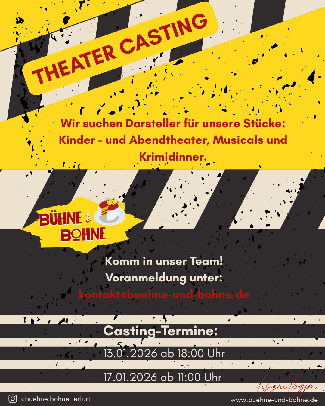 Du möchtest zum Casting, aber keiner der Termine passt? Melde dich trotzdem bei uns und wir machen einen individuellen Termin aus. Du kannst dich auch mit einem kurzen Video bewerben! Stell dich vor und zeig uns dein Können in einem Monolog, Song und/oder Tanz. Wir freuen uns auf deine Nachricht!